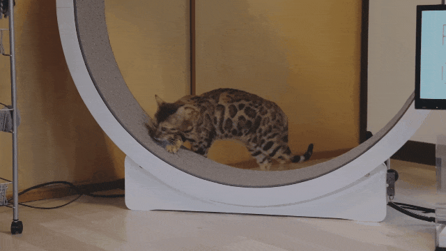 黑猫快递找来了一只和《狮子王》同名,名叫木法沙(Mufasa)的2岁孟加拉猫,通过在跑轮上跑步,来产生电力。实验时间是当天中午12点到第二天的中午12点,看看木法沙在这段时间里能够生成多少电力。与此同时,实验人员还用仓鼠作为对照组,比较一猫一鼠,谁才是勤劳的打工动物。