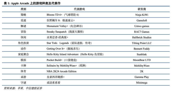 Apple Arcade上游戏种类丰富,部分国内公司已有游戏上线。目前,Apple Arcade已上线的游戏品类包括:策略类、竞速类、解谜类、冒险类、休闲类、角色扮演类、动作类、家庭聚会类、模拟类、卡牌类、体育类、桌游类、字谜类等,经典游戏包括《水果忍者》《纪念碑谷》《掘地求升》《捣蛋大脚怪》等。