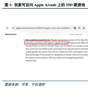 生产力:Vision Pro具有全新操作系统VisionOS,兼容iPhone和iPad上超100万个APP,并提供原生VisionOS应用,APP可置于空间各位置;并可作为Mac显示屏,支持妙控键盘等。我们认为几个比较重要的提升之处在于:3D展示带来信息承载量提升,如医学上器官模型呈现、视频会议真实感提升;无限屏幕空间多屏协同带来办公效率提升,如浏览器检索时的多界面呈现;多设备同步+近眼显示实现随地办公。有望发售即上线的生产力工具包括:办公软件《Microsoft 365》、日历应用《Fantastical》、数字白板《Freeform》、3D建模演示应用《JigSpace》、图片视频编辑器《Adobe Lightroom》、DJ应用&混音器《Djay》等。