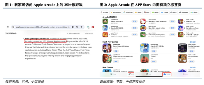 游戏:据苹果官网,玩家可访问APP Store上的游戏,包括Apple Arcade上的250+款游戏。Apple Arcade为APP Store内的一项游戏订阅服务,订阅价格6.99美元/月,订阅后玩家可无限制下载、体验上面的所有游戏,并且游戏内没有广告、没有内购内容。Apple Arcade相对独立,在APP Store内与“游戏”分类一样拥有独立标签页。
