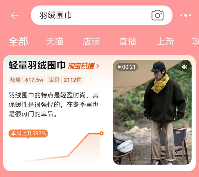 截至1月16日,淘宝平台“轻量羽绒围巾”的搜索热度达617.5万,一周内上升593%。(图片截自1月16日的淘宝平台搜索界面)