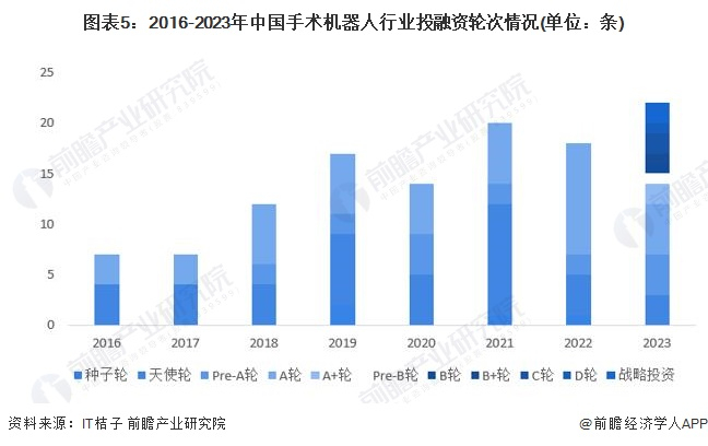 从2016-2023年12月手术机器人制造相关行业的投资轮次分析,目前手术机器人相关行业的融资轮次仍然处于早期阶段,融资事件主要集中A轮以前。