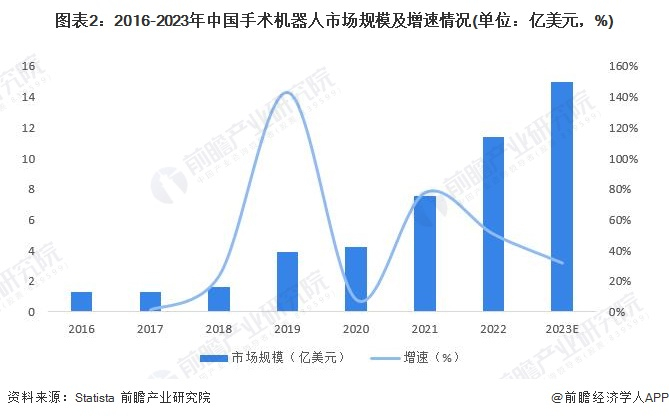 根据Statista数据,2021年,中国手术机器人市场规模达7.55亿美元。与2016年相比,中国手术机器人的需求大幅增长。此外,根据Statista估计,到2022年市场规模增至11.37亿美元。结合近年来的市场增速,前瞻初步估计2023年中国手术机器人市场规模或将达到15亿美元以上。