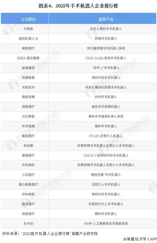 中国手术机器人市场的竞争情况日益激烈。国内主要手术机器人企业包括天智航、柏惠维康、思哲睿、威高集团、赛诺微、微创机器人等。根据互联网周刊发布“2022医疗机器人企业排行榜”。上榜的手术机器人企业及其代表产品如下所示: