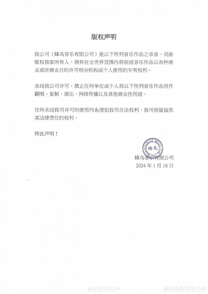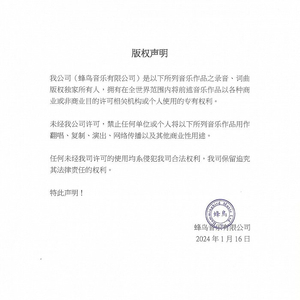 1月16日,邓紫棋前公司蜂鸟音乐发布了一则版权声明,声称自己是邓紫棋在2008到2018年签约期间制作发行的共计103首歌的录音、词曲版权独家所有人。