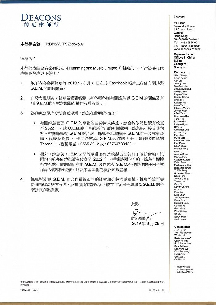 音乐先声注意到,在对蜂鸟音乐的诉讼中,邓紫棋指出,因为公司作出虚假陈述,她才会签下作曲人和歌手合约,因此主张该合约无效。同时,称蜂鸟音乐在未经自己的同意,擅自在香港和内地登记“G.E.M.”和“邓紫棋”商标。