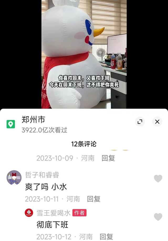 事实上,蜜雪冰城在小红书、抖音上的瓶装业务宣传账号“雪王爱喝水”,早在2023年10月便停止更新,其中的抖音账号曾在2023年10月12日回复评论称“彻底下班”。