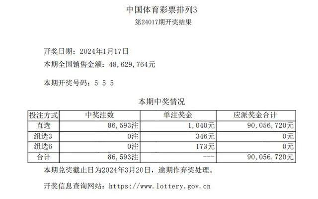 据中国体彩官网显示,该期“排列3”全国销售金额48,629,764元,直选中奖注数86593注,单注奖金1040元,应派奖金合计90,056,720元。