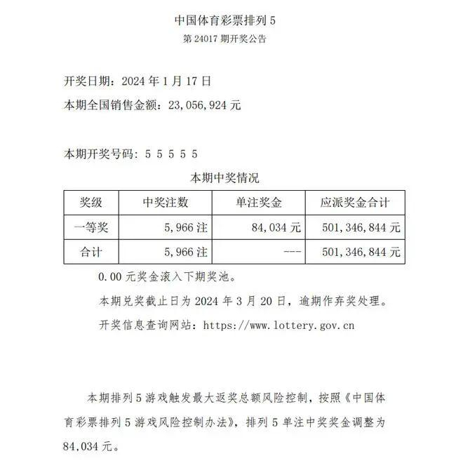且该期排列 5 游戏触发最大返奖总额风险控制,按照《中国体育彩票排列5游戏风险控制办法》,排列5单注中奖奖金调整为84,034 元。