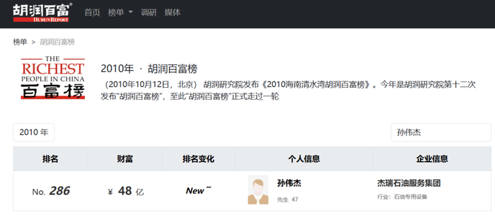 自2010年杰瑞股份上市后,孙伟杰的身价也随之高速增涨。2010年,其以48亿元人民币财富首次上榜胡润百富榜。此后每年,孙伟杰都会登上该榜。甚至2013年时,其财富值达到了180亿元,位列榜单47位。