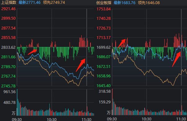 拿沪指和创指举例,早盘10点前后和11点半前后(含下午开盘前几分钟),出现了两波拉升。