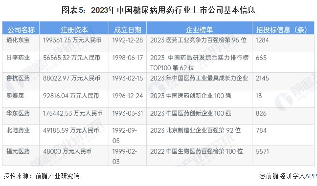 2、糖尿病用药行业上市公司基本信息对比