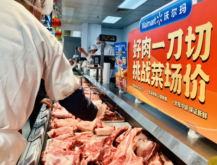 另一种方式则是利用规模化的采购来获得议价权。界面新闻在现场看到,沃尔玛中国推出的每斤不超过9.9元“冷鲜猪肉一刀切”吸引到较多消费者购买。这则是沃尔玛中国通过与全国大型肉联厂的规模化集采把肉价“打下来”,做到价格低于周边两公里内的菜市场水平。