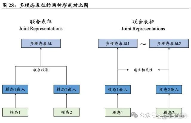论文《Multimodal Machine Learning: A Survey and Taxonomy》列举了多模态学习中 的五个主要的研究方向: (1) 表征(Representation):如何表示和总结多模态数据,以利用不同模态的互 补性和冗余性。由于多模态数据的异质性,构建这样的表征是具有挑战性 的,主要分为两类表征方法:联合表征(Joint Representations)和协同表征 (Coordinated Representation)。联合表征将多种模态的表示融合映射到一 个统一的向量空间中;协同表征则是将不同模态映射到不同的向量空间, 但映射后的向量之间满足一定的约束关系。