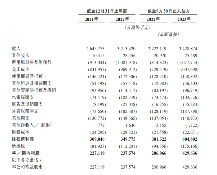 在经营情况方面,招股书显示,2021年、2022年、2023年前三季度,小菜园的营收分别为26.46亿元、32.13亿元和34.29亿元,净利润分别为2.27亿元、2.38亿元和4.30亿元。值得注意的是,2023年前三季度的净利润较2022年同期的2.07亿元上涨了107.6%。