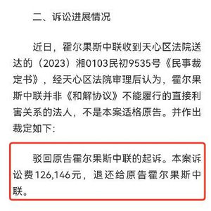 1月17日晚,大晟文化公告披露,霍尔果斯中联收到法院送达的《民事裁定书》,法院审理后认为,霍尔果斯中联并非相关协议不能履行的直接利害关系的法人,不是本案适格原告。法院裁定驳回原告霍尔果斯中联的起诉。
