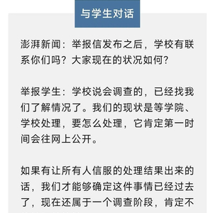 18日凌晨,举报学生一同在自习室接受了采访,“精神肉体都很疲惫。”举报材料从起草到发布经历了一个多月,举报学生表示,“我们也不希望以后有人接着来课题组面临跟我们一样的情况,磨灭掉对科研和学习的热情。”