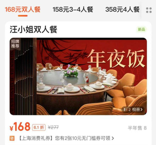 除此之外,还有一些餐厅在售卖“汪小姐双人餐”“宝总泡饭”,或是带有“宝总推荐”字眼的套餐。第一财经记者致电该商家询问是否获得了《繁花》版权方的授权时,对方表示不清楚,如果侵权可以下架。