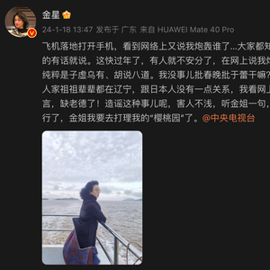 1月18日中午,金星在社交平台上辟谣“炮轰”春晚,发文力挺于蕾。她说和于蕾二人是老乡,于蕾祖祖辈辈都在辽宁,根本没有网传的那些事儿。自己也不存在网上说的“炮轰”春晚,“怒批”于蕾,这些事完全是“子虚乌有”。呼吁大家不要相信网上的谣言。