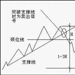 当颈线跌破后,我们可根据这型态的最少跌幅量度方法预测价格会跌至哪一水平。这量度的方法是一一从头部的最高点画一条垂直线到颈线,然后在完成右肩突破颈线的一点开始,向下量出同样的长度,由此量出的价格就是该股将下跌的最小幅度。