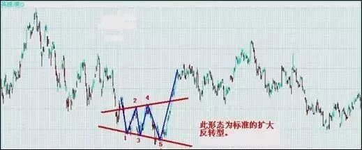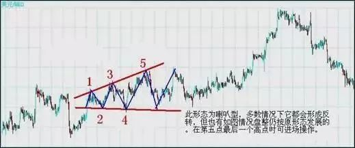 价格经过一段时间的上升后下跌,然后再上升再下跌,上升的高点较上次为高,下跌的低点亦较上次的低点为低。整个型态以狭窄的波动开始,然后和上下两方扩大,如果我们把上下的高点和低点分别连接起来,就可以画出一个镜中反照的三角形状,这便是喇叭形。