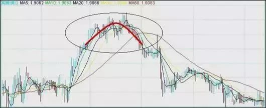 价格呈孤形上升。即虽不断升高。但每一个高点亦不了多少就回落,先是新高点较前点高,后是回升点略低于前点,这样把短期高点连接起来,就形成一圆形顶。在成交量方面也会有一个圆形状。