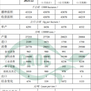 根据国家统计局公告,2023年,中国玉米播种面积44219千公顷,比上年增加1149千公顷,增长2.7%;单位面积产量每公顷6532公斤,比上年增加96公斤,增幅1.5%;总产量28884万吨,比上年增加1164万吨,增幅4.2%,创历史新高。2023/24年度玉米生产预测数据据此调整。目前,农户售粮进入传统高峰期,市场供应充足,预计后期售粮进度有所加快。