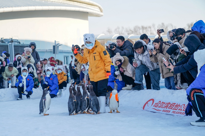哈尔滨极地公园的文旅IP“淘学企鹅”亮相哈尔滨极地馆极地广场,憨态可掬的企鹅吸引许多市民驻足拍照。图为企鹅与饲养员互动。(图片由CNSPHOTO提供)