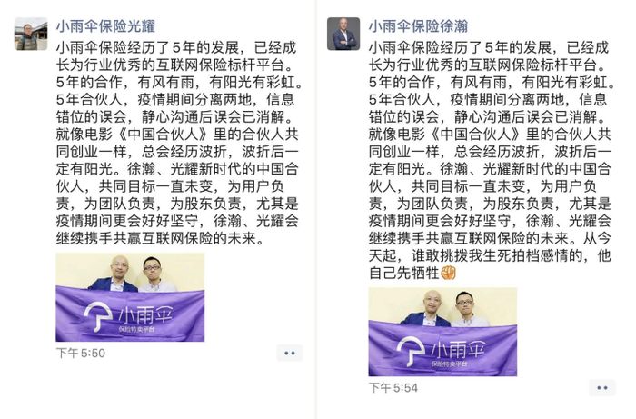 同时,光耀也发布了一条内容相似的朋友圈,回应了“误会”。在“握手言和”半年后,这场风波最终以徐瀚的离开画上句点。天眼查信息显示,小雨伞母公司手回科技管理层于2020年11月发生变动,原董事长徐瀚退出,其职务由光耀接任。