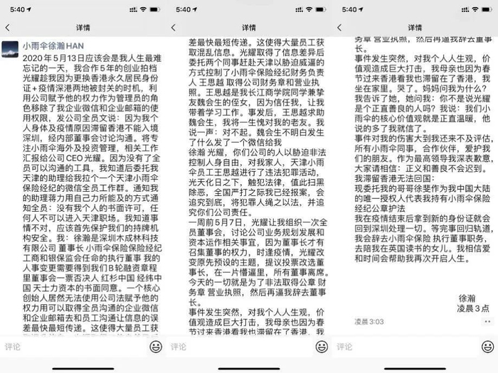 2020年5月13日凌晨,徐瀚在朋友圈发布消息,控诉其合作5年的创业拍档光耀趁其更换香港永久居民身份证、疫情深港两地被封关的时机,利用公司赋予权力作为管理员的角色移除了徐瀚企业微信和企业邮箱的使用权限。