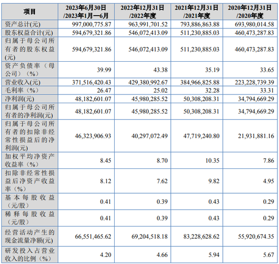 (2) 资产负债率高于同行:招股书显示,2020年末至2023年6月末,戈碧迦的资产负债率依次为33.65%、35.60%、43.35%和40.35%,高于同期同行业可比公司的资产负债率均值28.41%、24.12%、28.17%和27.88%。