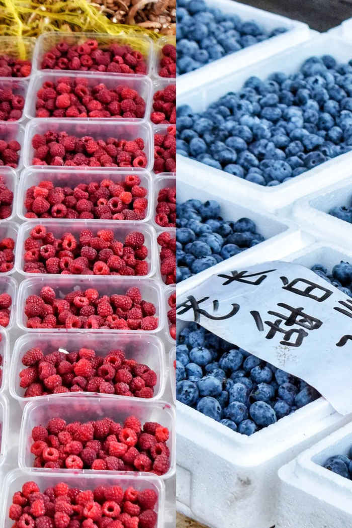 东北早市的红树莓和蓝莓。(摄影/大脚CL)