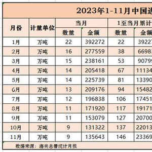 与此同时,2023年我国猪肉进口量出现逐月下降的趋势,从1月的22万吨/月降至11月的9万吨/月。朱增勇也提到,2024年我国国内猪肉供给仍然较充裕、猪价窄幅波动,预计2024年我国猪肉进口需求还将会继续小幅下降。‘’