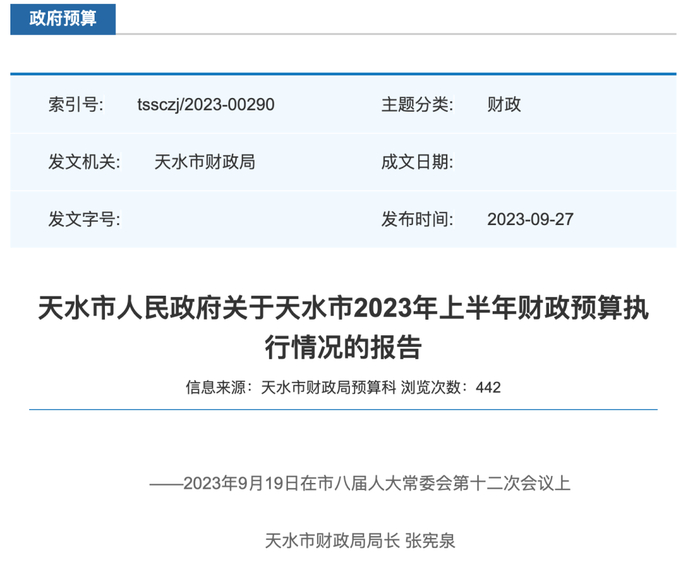 2023年9月,天水市财政局公布的《天水市人民政府关于天水市2023年上半年财政预算执行情况的报告》(下称《报告》)显示,2023年上半年,天水市一般公共预算收入27.53亿元,占预算的53.08%,高于均衡进度3.08个百分点,增长24.82%;全市政府性基金收入7.43亿元,占预算的7.46%,低于均衡进度42.54个百分点,下降30.22%。全市一般公共预算支出179.21亿元,占变动预算的62.36%,高于均衡进度12.36个百分点,增长7.78%;全市政府性基金预算支出28.98亿元,占变动预算的33.23%,低于均衡进度16.77个百分点,下降54.32%。