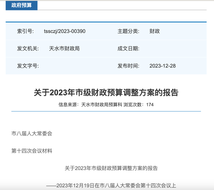 天水地处甘肃省东南部,共113个乡镇、10个街道办事处,总面积1.43万平方公里,其政府官网显示,2022年末天水市全市常住人口295.44万人,城镇人口140.81万人。在甘肃下辖的14个地市州中,天水市经济总量和财政收入规模相对靠前。不过近些年跟多数地方一样,当地财政收入出现下滑。