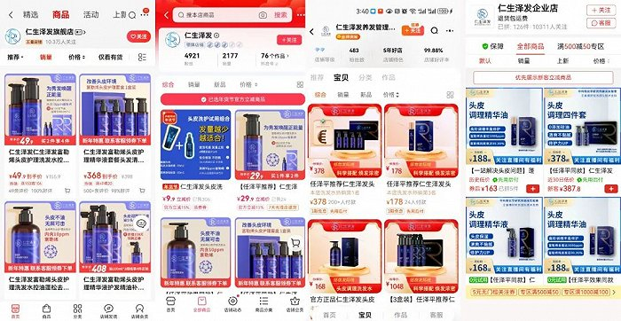 截至目前,仁生泽发的相关产品在京东、淘宝、抖音、拼多多等线上平台均有销售,主推398元的富勒烯头皮护理套盒,但销量一般。