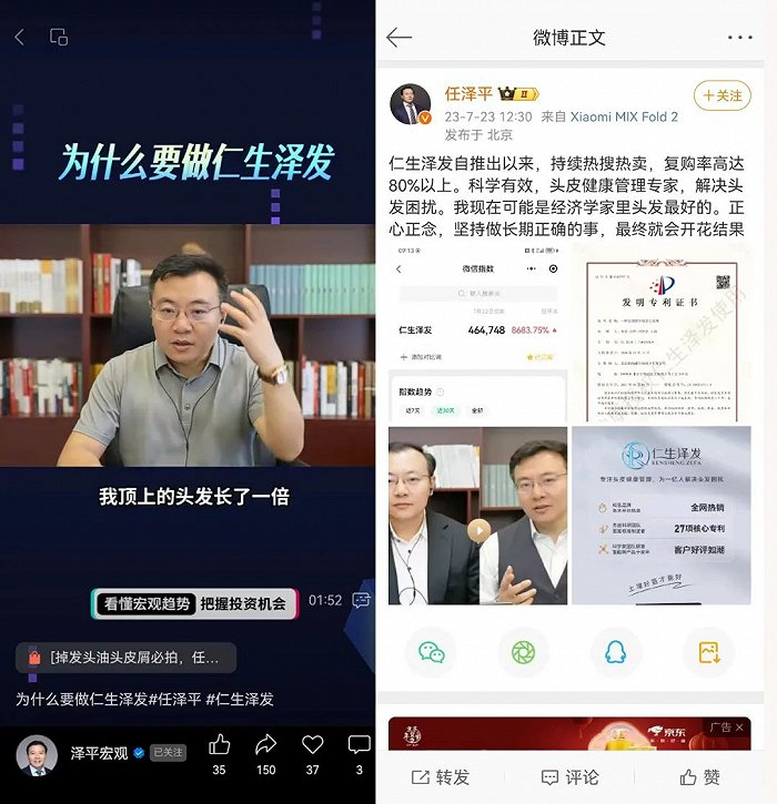 早在2023年上半年,任泽平就通过自己的微博、公众号等平台开始多次为仁生泽发项目造势,称自己亲身使用了相关产品,并晒出使用该产品的前后对比照,称头发涨势喜人。