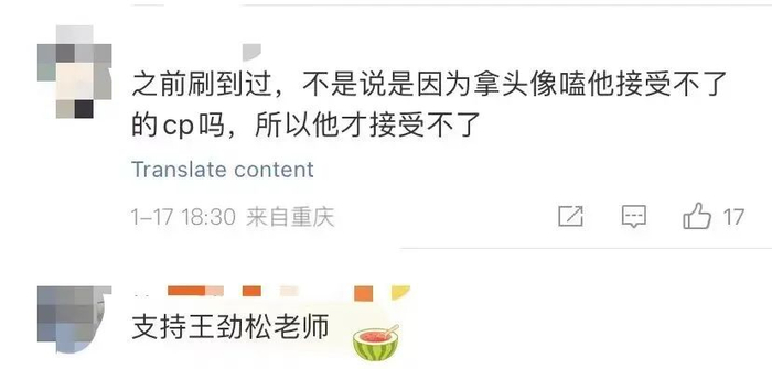 此外,在评论区中,王劲松也回复了一些使用其照片做头像的网友,要求网友不要使用自己照片做头像,还回复一位网友“CP粉远离,不需要”。(注:CP粉指钟爱剧中某两个角色,并将角色以情侣身份捆绑在一起喜爱的粉丝)