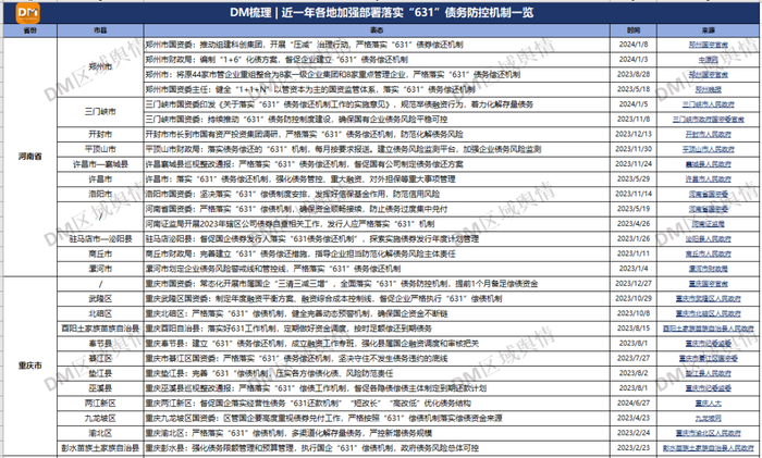进入2024年,多地开始落地“631”债务偿还机制。1月3日,娄底市:督促各平台公司严格执行“631”债务偿还机制,切实防范平台公司债务风险向财政转移。怀化市沅陵县编制“631”偿债机制,组织相关债务单位逐笔提前6个月预警、提前3个月调度、提前1个月落实还本付息资金来源。郑州市指导各级平台公司加快市场化转型,督促企业建立“631”债务偿还机制,谋划好到期债务偿还措施。
