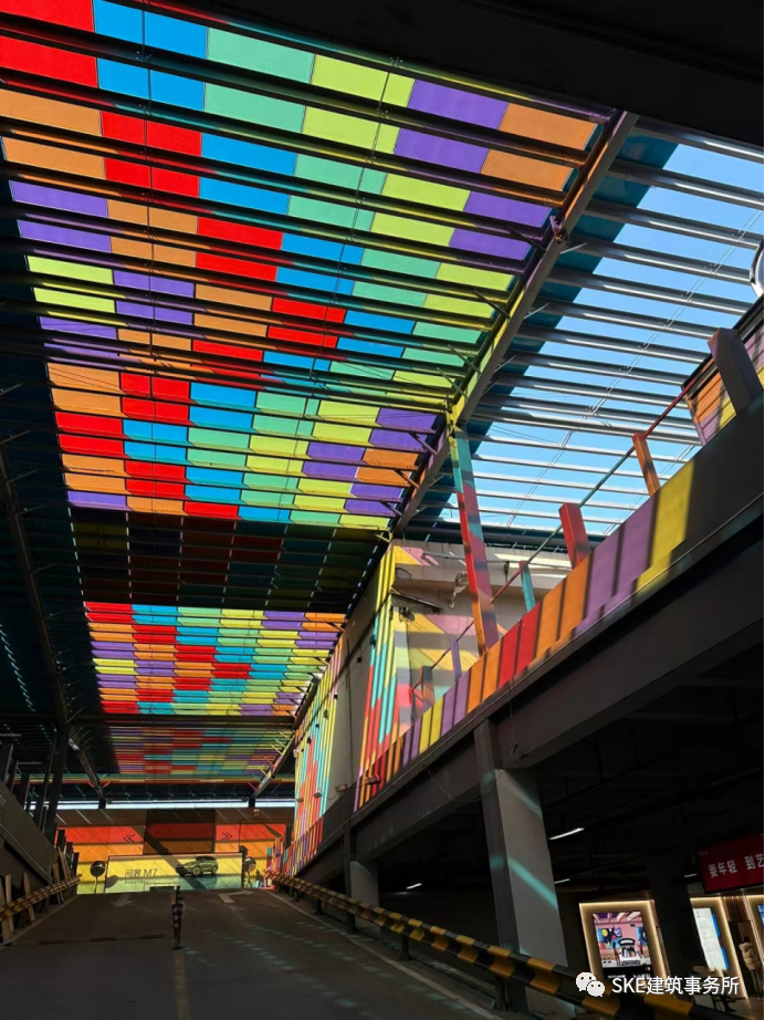 原本为露天停车场,去年做了框架顶棚,顶棚巧妙地选择了彩色的半透顶棚,在阳光照射下出现绚丽的彩虹光影。用小的改变制造创意的美,为消费者带来幸福感。