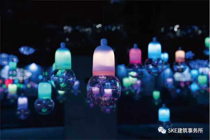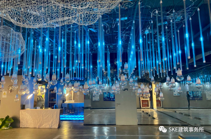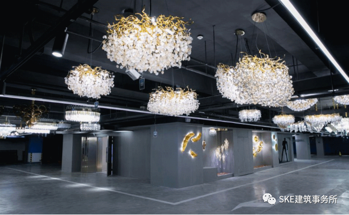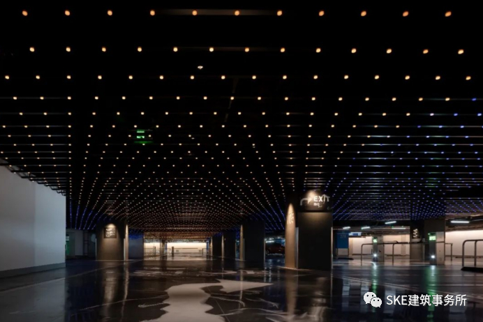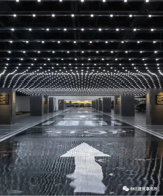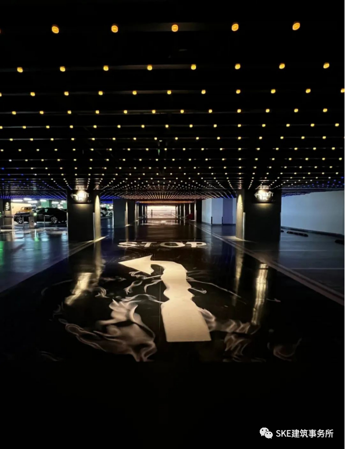 造型独特的灯具,根据停车场的不同空间选择特色灯具并定制布局,让从泊车区直到进入商场的电梯厅,强化了停车场引流动线,增强了消费者体验感。