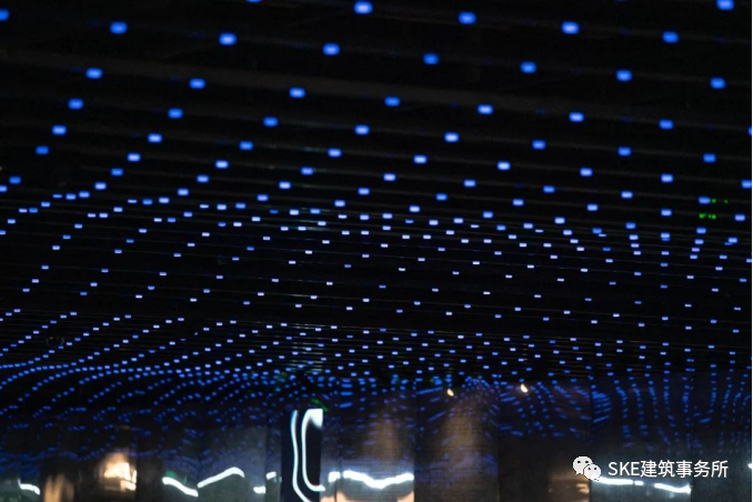 LED灯被串联在数百根弧度各不相同的黑色钢架结构上,创造出一片大型的波纹天花板。这个从自然界抽象出来,又被重新表达于上空的“水面”,加上精细编程的灯光模式,从早到晚,对应着或是初醒,或是热烈,或是慵懒的城市节奏,给原本沉闷的地下空间注入了活力。