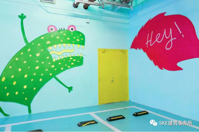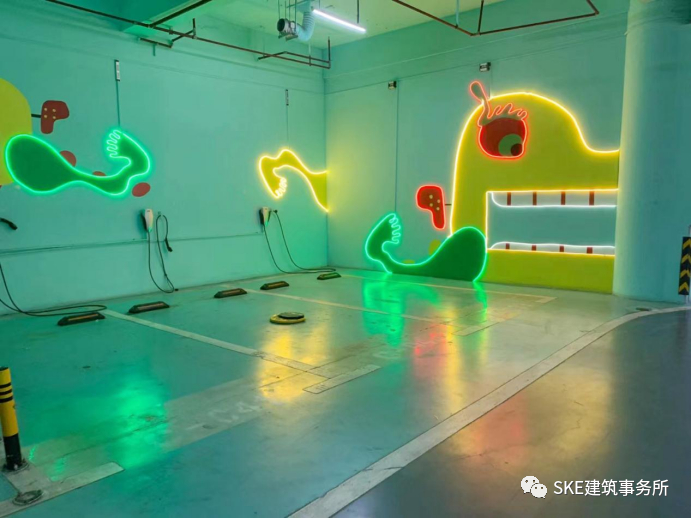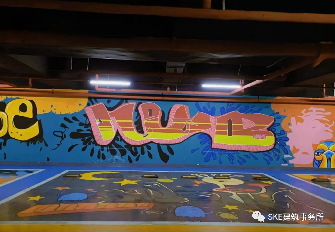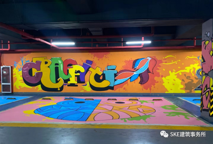 在停车位的地面以及四周墙面都全部是艺术涂鸦,色彩鲜艳、造型夸张,让大众对于印象中的暗沉灰色的地下停车场大为改观。