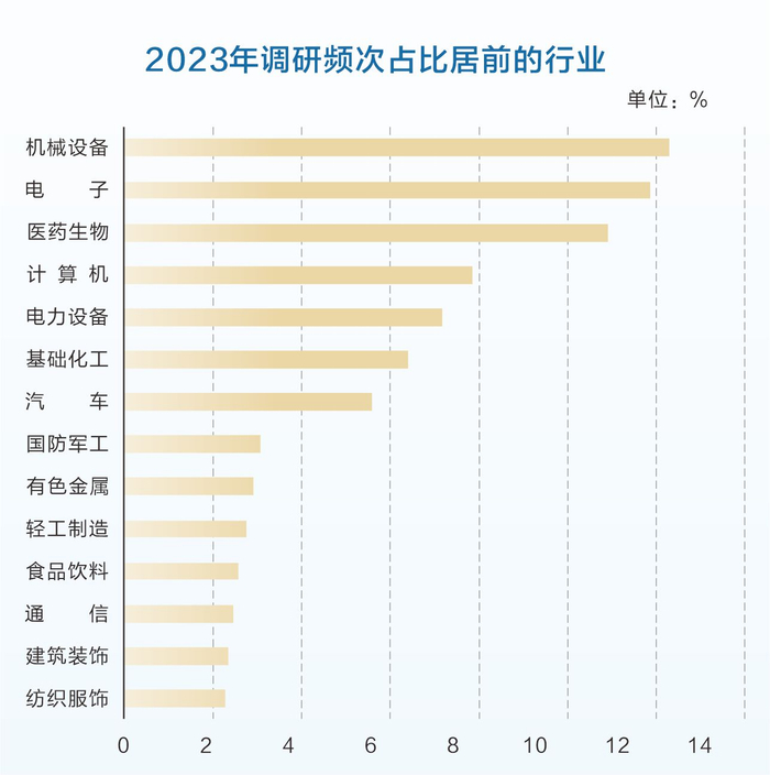 2021年以来,机械设备行业的调研频次占比持续领先,2023年达到高点,占比为12.28%。机械设备行业中,既包含传统的工程机械,亦包括机器人、工业母机等高端制造业。