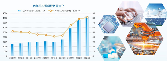 分行业来看,近十年来,机构调研股主要集中在五大行业,包括机械设备、电子、医药生物、计算机、电力设备。2023年,这五大行业调研频次占比合计50.06%;其他还有基础化工、汽车,占比超过5%,可以看出机构调研主要关注成长潜力大的战略性新兴产业。