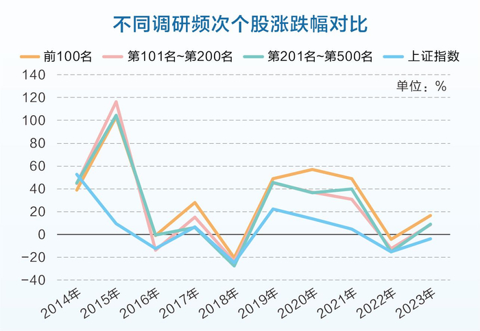 机构高频次调研一只个股,该股的市场热度也随之上升,由此带来的正面效益显而易见。除2014年外,2015年到2023年的九年时间内,调研次数排名前100的个股每个年度平均涨幅均跑赢同期上证指数。2023年A股市场走势低迷,上证指数下跌3.7%。机构调研次数排名前100的个股2023年平均涨幅达到16.77%,超同期上证指数20.47个百分点。