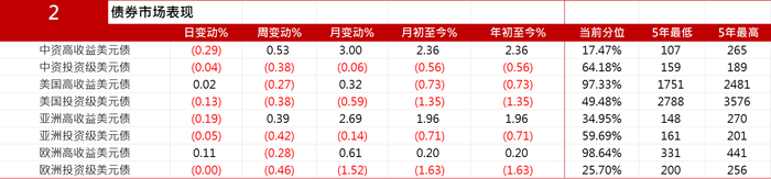 二级市场方面,中资美元债投资级市场上涨,国企板块,中石油、中海油收窄1-2bps;科技板块,标杆债券如腾讯、百度收窄1-2bps;金融板块利差收窄3bps左右;投资级地产表现较为稳定;高收益地产板块小幅走弱,万达持续下跌3pt左右,新城、路劲下跌2-3pt左右。