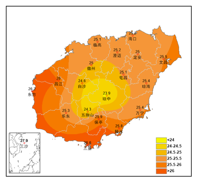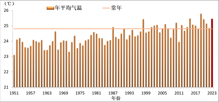 2023年,海南省年平均气温25.4℃,较常年偏高0.6℃,与1998年和2020年并列成为历史第三偏暖年,仅次于2019年(25.8℃)和2015年(25.5℃)。其中,三沙年平均气温27.9℃,与2016年和2019年的历史最高纪录持平,临高、文昌、五指山、保亭、澄迈和乐东等市县年平均气温位居当地历史前3位高值。