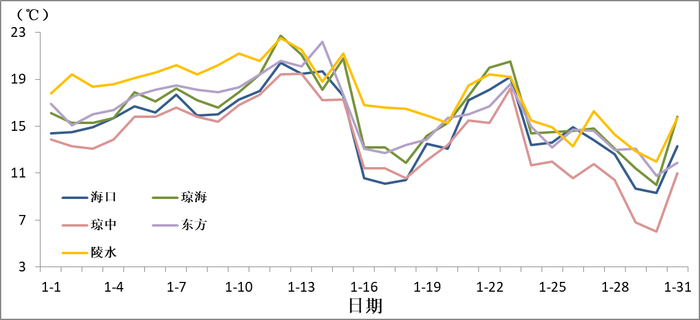 2023年1月海南省五个市县逐日最低气温变化(单位:℃)