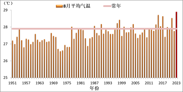 1951~2023年8月海南省平均气温变化(单位:℃)
